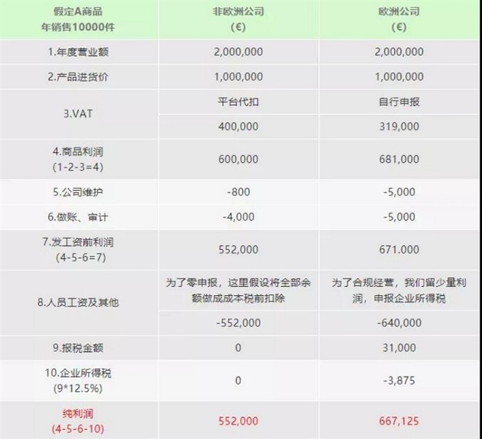 4、此案例我們假設100歐元的商品、銷售10000件,對比產生的差距。如果電商的銷售額更大,差額會更加顯著;